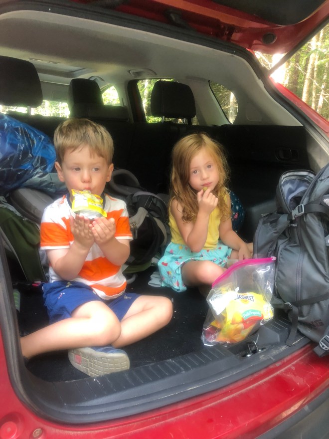 I’d wanted to hike Heaven Hill, but was planning to save it for Friday. No matter – Thursday it was. We arrived, found parking, and let the kids sit in the trunk of the SUV to eat their snacks. Don’t mind the underwhelmed expressions on their faces. They were tickled to have snack back there. What is it about kids and the trunk of an SUV? I used to LOVE sitting in the “way way back” of my parents’ Explorer.