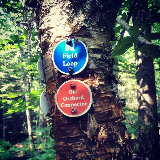 Our goal was the Orchard Loop, around a large-ish meadow with gorgeous mountain views. To get there, we followed the orange “Old Orchard Connector” trail markers.