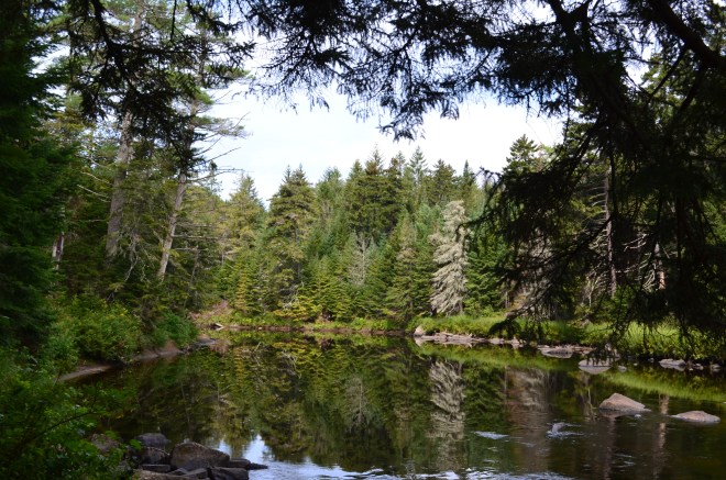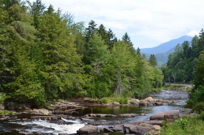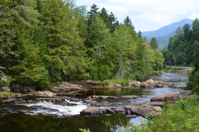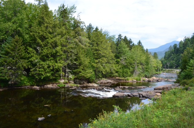 On the final Saturday morning of our vacation, we woke up to the bittersweet knowledge that we’d be back in the real world before long. We were planning to drive back to my parents’ house that afternoon, but we wanted to squeeze one more hike in before the vacation came to an end. Looking for something short and easy with a big payoff, we hit on Monument Falls – more a section of rapids on the Ausable River than an actual waterfall, but right off the main road, with smashing views of Whiteface Mountain and access to a trail winding its way upriver.