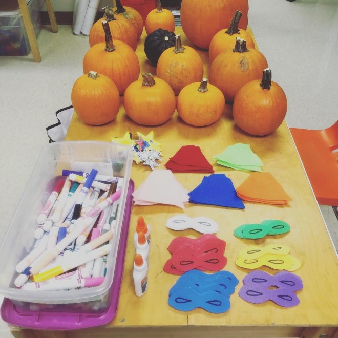 Making. About thirty felt capes and the same number of foam sticker superhero masks for the kindergarteners’ pumpkins. They looked homemade, but the kids didn’t care, and it was a labor of love.