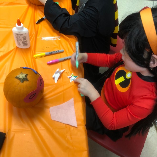 We had each of the kids bring in a smallish pumpkin earlier in the week, and I set out sticky foam masks and felt capes (which I made while listening to my audiobook the night before) to turn the pumpkins into superheroes.  Each class in the school has a theme, and Peanut’s class is “the K Team,” with a superhero motif for the year.  The superhero pumpkins were a huge hit and the kids loved decorating them.