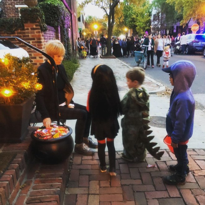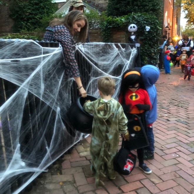 Every year, we go to a particular street in our neighborhood to trick-or-treat.  The street closes to traffic and becomes a massive block party, and it seems like half the town turns out.  The residents of the street get really into it – decorating their houses to the nines and pulling out all the stops on costumes.  There are huge, elaborate cauldrons heaped with candy, smoke machines, flashing lights, and families in coordinated costumes swarming all over.  We always run into school friends in the crowd, and it’s one of my favorite events of the year.