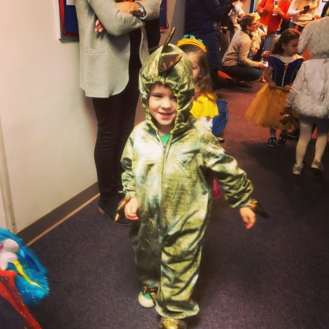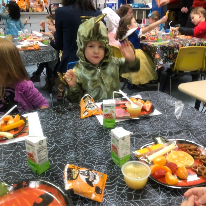 After I set up the art project, I slipped out of the classroom to enjoy the costume parade.  Preschool was first.  There’s my ferocious dinosaur!