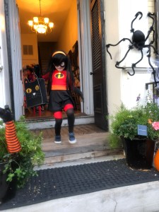 This year, we made plans to meet up with our friends who recently moved to the area from California.  Their baby – who was dressed as Jack-Jack Incredible to coordinate with my Violet – fell asleep in the car and missed the fun, but the three older kids had fun going door-to-door together.