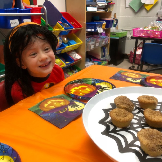 After the parade, the kids returned to their classrooms for a special snack and Halloween party.  Food first!