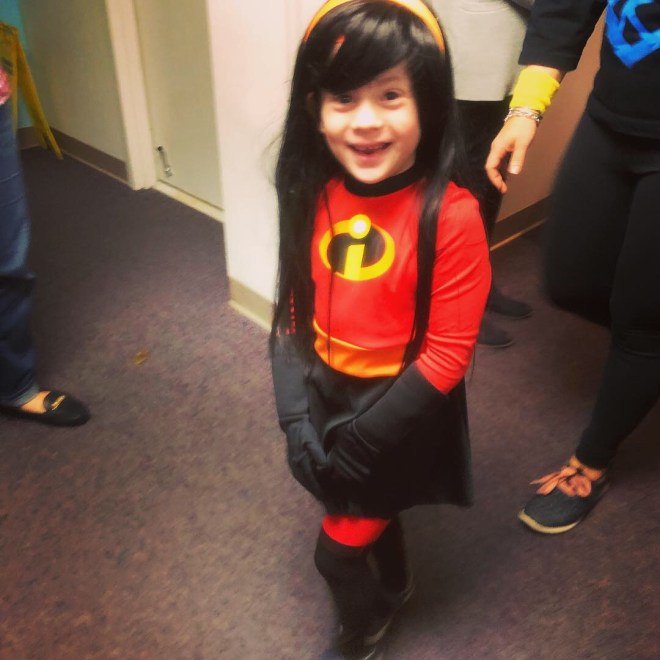 Junior Kindergarten was next, followed by Kindergarten – Peanut brought up the rear, dressed as Violet from The Incredibles.  (No forcefields!)  Can you even handle her wig?!?!