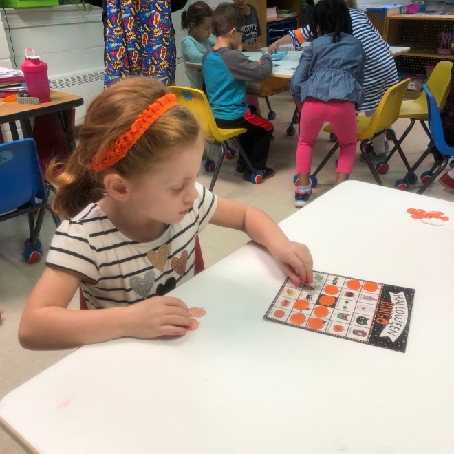 The costumes came off and the party wrapped up with a game of Halloween bingo.  I respectfully but emphatically declined to be the “caller” and instead hung out with Peanut and helped her fill in her bingo card.