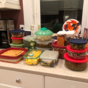 Making. FOOD! Lots and lots of food. Sunday afternoon’s batch cooking includes: pasta e fagioli; red lentil dal; sliced snack veggies; gardein taco “meat”; diced fresh mango; steamed tricolor cauliflower and broccoli; roasted tempeh; roasted tofu; plain chickpeas; steamed einkorn; dry-roasted mushrooms; white bean and sundried tomato dip; raw grain-free granola; and cornmeal breakfast cake with chocolate chips (a concession to the kids). All in all, less than three hours of work, and this will probably get me through two weeks of lunches and dinners.