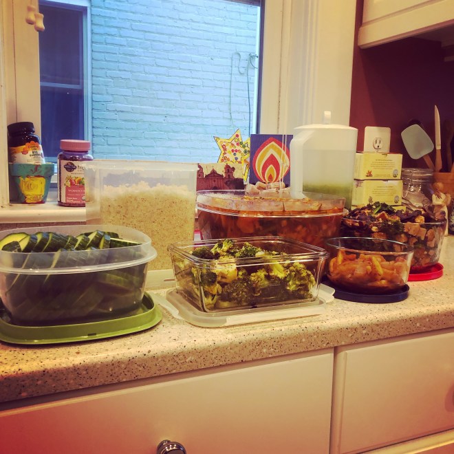 Making. Another batch cooking extravaganza! Sliced cucumbers; a double batch of quinoa; goddess broccoli; cabbage soup with chickpeas; stewed cinnamon apples; cucumber-cilantro juice (don’t knock it ’til you try it); and a stir-fry of tofu, mushrooms and mixed greens. Plus unpictured pomodori al forno (yes, again). We will be eating well this week.