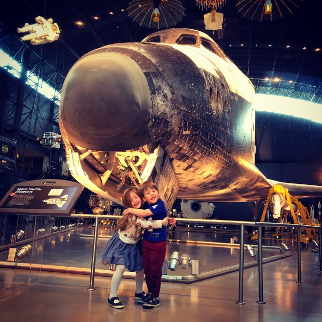 On Saturday night, I decided that the next day I would reward the kids for being only moderately insane while we ran errands and take them to the Udvar-Hazy Air and Space Museum out by Dulles Airport. Minutes after I told Steve about my plan, my phone chirped: another mom in Peanut’s class had texted our “K team moms” group text to see if anyone wanted to go to Udvar-Hazy. I replied immediately, and a planned solo outing turned into a friend date. Yay! We made a day of it on Sunday: drove out in the morning, the kids spent several hours running around with Peanut’s friend, and then we all had lunch at McDonald’s together (livin’ the dream, livin’ the dream). I gave myself a well-deserved couch night on Sunday night. I was wiped.