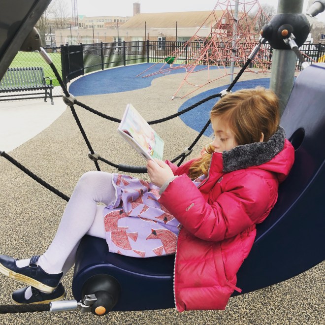 This weekend, I told Steve that all week long, I look forward to weekends (not because my job is unpleasant – it isn’t – but because I crave that time of my own, to let my brain breathe and be with my family) and by Sunday night, all I want is the workweek.  The kids were just grinding. me. down. this weekend.  Nothing major, just lots of little things – not listening, refusing to cooperate, backtalk, bickering.  I’m ready for my quiet office and a to-do list that I can understand.  That’s not to say we had a bad weekend, because we didn’t, really.  Steve had to work again, so I ran interference for him.  On Saturday, I took Nugget for a haircut and then we walked out to the library – and straight into the staging area for the town St. Patrick’s Day parade.  I know what you’re thinking: isn’t St. Patrick’s Day like two weeks away?  Yes.  Yes, it is.  But that’s just how we roll in NoVA, and if you don’t know, now you know.  On Sunday, Steve was craving some fresh air, so we walked out to the playgrounds as a family.  My mini bookworm plunked herself down with her reading material and ignored the rest of the family – even during the family soccer game.  She was my co-goalie and she was beyond useless; didn’t make a single save, just sat inside the goal and read – I was so proud.  The rest of Sunday was low-key.  Peanut played in her room, Nugget kept me company while I folded laundry and organized the kids’ Christmas presents, and I don’t actually know what Steve did.  And now another week is upon us, and I’m sort of glad to get back into the swing of things.  My clients don’t always listen to me, either, but at least they don’t call me a “dummypants.”