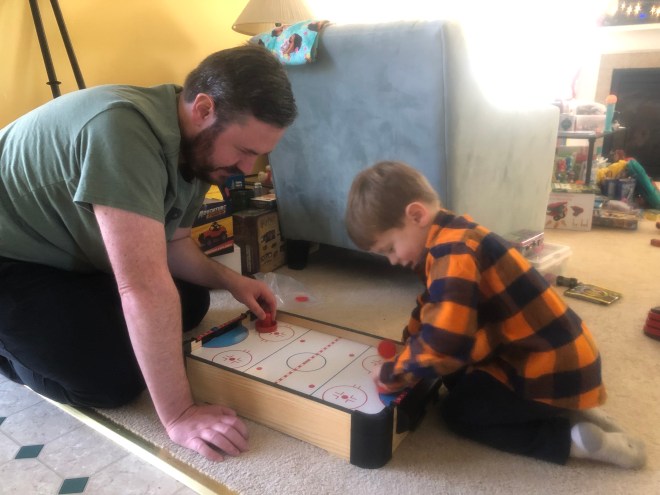 Here’s another of your recent obsessions: air hockey.  (Thanks, Grandad.)  You cheat on every point and you change the rules whenever you’re losing despite your cheating.  Yet somehow it’s still really fun to play with you.