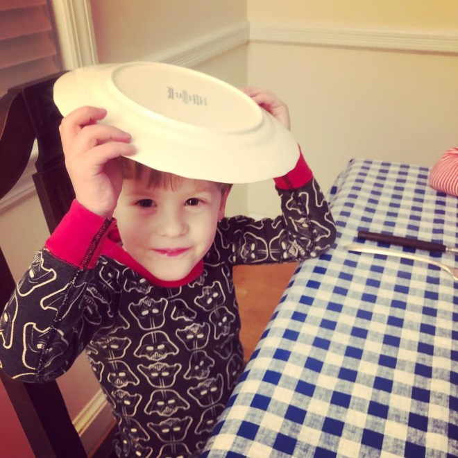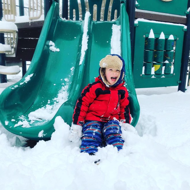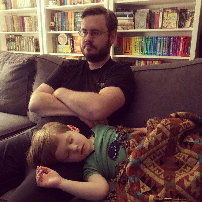 You’re still a Darth Vader kind of guy, although you’ve expanded your fandoms to include Ghostbusters, thanks to your best buddy, who loves Peter Venkman as much as you love Anakin Skywalker.  Daddy has enjoyed introducing you to the classic Ghostbusters movie and to The Real Ghostbusters cartoon, but we have been less excited about all the nights you’ve spent in our bed due to scary dreams.  You’re probably sleeping with us five nights out of seven these days.  We’re all a little tired, but it won’t last forever, and I for one will miss the snuggles when you’re back in your own bed full-time.  Another recent fandom: the Marvel universe, and Spider-Man in particular.  I think it’s pretty cool that you’re getting into comics, although the last thing we needed was for you to imagine radioactive spiders in your room at midnight.