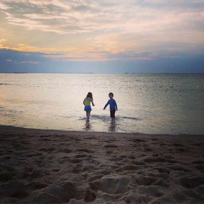 Good… afternoon, friends! Happy long weekend to those of you who are celebrating, and happy Monday to all! No morning post scheduled, because we were away this weekend – visiting our friends Rebecca and Eric in Virginia Beach – and were traveling back today. I’m now back in NoVA, my fridge is stocked with fresh sliced fruits and veggies and homemade vegetable soup, I have a pot of homemade vegetable stock simmering on the stove, and I’m ready to begin a new week. Our weekend started early – I worked from home on Friday, and Steve and I drove to the kids’ school together to pick them up at dismissal, and then we rolled right on down to the beach. Woke up on Saturday morning ready to have fun and to soak in some sun and saltwater! It was a relaxed, laid-back weekend; we mostly just hung around the neighborhood beach (on the Chesapeake, not the Atlantic, so it’s calmer and a little more kid-friendly) and trundled back and forth between the house and the beach in Eric’s golf cart. This was probably the last time we visit them here, as they’ve officially put their house on the market and are preparing to move to Florida (sob). No guarantees, though – if the house takes a little while to sell and they’re still around at the end of the summer we could mosey on back for Labor Day, but we’re not expecting anything. Knowing that this was probably the last visit to them in VB, we devoted the weekend to together time. There was lots of laughing, some cooking, and plenty of belly scratches for Rebecca and Eric’s dog, Brandy. We took in two sunsets down at the beach, ate some fresh seafood, drank a few beers, and did some paddleboarding on the Bay (it was choppier than usual, and I fell off the board and lost my hat). All in all, a soul-satisfying and revitalizing weekend. If it’s a sign of things to come, we’re in for a good summer.