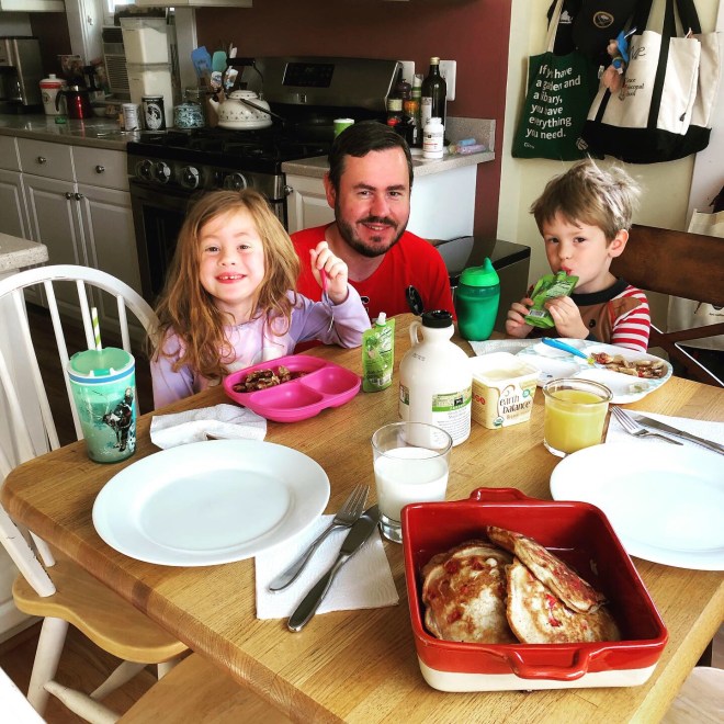 On Sunday, we attempted to let Daddy sleep in a little, but he rolled downstairs at about 7:00 – oh, well. We had strawberry pancake batter all mixed up and ready for the griddle – prepped by the kids and me, with spiritual assistance from Rachael Ray – and we served him up a sweet breakfast. After that, Daddy wanted a low-key day around the neighborhood and some time to “do man things,” so I ran interference while he went to Home Depot ALL ALONE, which he seemed to enjoy, and then filled up the propane and cleaned the grill. The rest of the day was devoted to wandering the neighborhood – we hit the playground and the pizza joint, and I took Nugget to the library to get him out of Steve’s hair later in the afternoon – and then we fired up the grill for the first time since moving into this house (embarrassing, I know). For the first grilling, we went with Beyond burgers on brioche buns – YES. MOAR THIS. Happy day, Daddy. We hope we made you feel as special as you make us feel all year long.