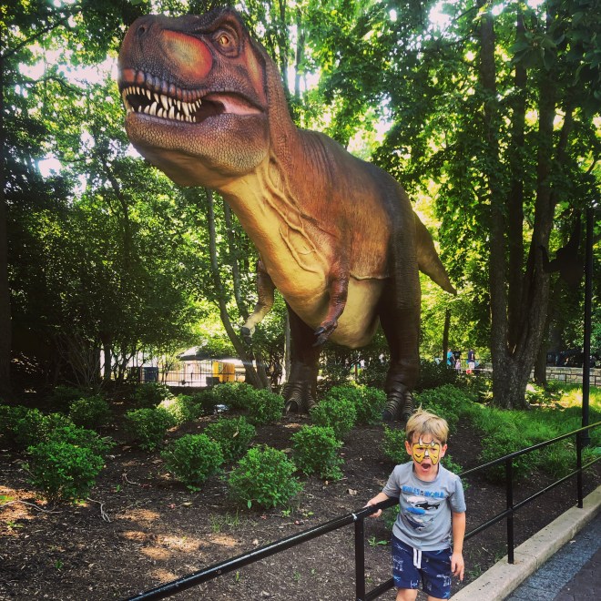 On Sunday morning, Nugget asked to go to the zoo. He’d just been there the previous week with his grandparents, and we were planning a relaxed, low-key neighborhood day, so we said no – at first. Then the downward spiral began, and before long I found myself painting Nugget’s face like a triceratops while Steve ran around packing snacks and water for the zoo. It happens. (Peanut declined face paint this time, in case you thought I was a meanie who only painted one of my children’s faces. There’s a sentence I never thought I’d write.) After the zoo, we pounded a quick lunch and then hit the neighborhood pool, while the kids showed off their new tricks from summer swim lessons. (Note to self: check the deadline for registering them for fall swim class.) After the pool, we stopped at our next-door neighbors’ house to drip all over their furniture and ruin the kids’ dinner appetites with 4:30 p.m. ice cream. Parents of the year! I ended the weekend hunched over my laptop, pounding out the work that I didn’t get to earlier in the weekend. And so begins another week. I’m exhausted.