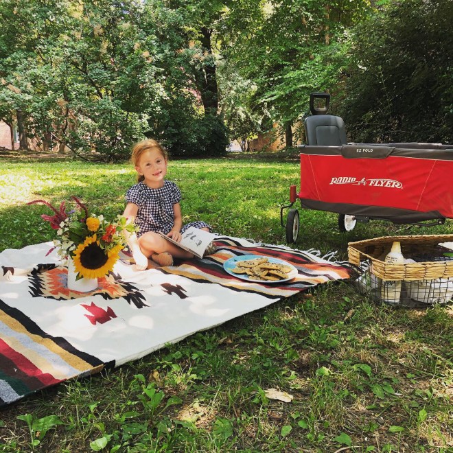 Actually, they could have been worse. It was pretty much the normal amount of belligerence and not-listening. And we did have fun. On Saturday, I let them ease into the weekend and spend some time with their own toys after a week of camp, then we headed out for our afternoon activities – Nugget to see his first movie in the theater (Toy Story 4 with his former nanny – I was a little sad to miss out on his first movie theater experience, but I figured she’d earned the milestone) and Peanut and me to a sweet little secret garden across the street from the library, where we pitched a picnic blanket, set out cookies and lemonade, and hosted two of her friends for a “reading party.” Peanut came up with the idea herself – she’s been planning it for months – and I was glad to make it a reality. On Sunday, we logged a couple of hours at the playground and then hit up a pool party for the rising first graders at Peanut’s school. The kids had a fun time playing with their friends and the moms caught up on summer plans and exchanged vacation recommendations. I left with several restaurant suggestions for our upcoming trip to Duck. (Although I’m not sure I’ll be able to find “the hole-in-the-wall crab shack in Kitty Hawk,” come to think of it.) All in all – a fun weekend, but tiring. We sure were glad to see Daddy back on Sunday evening.