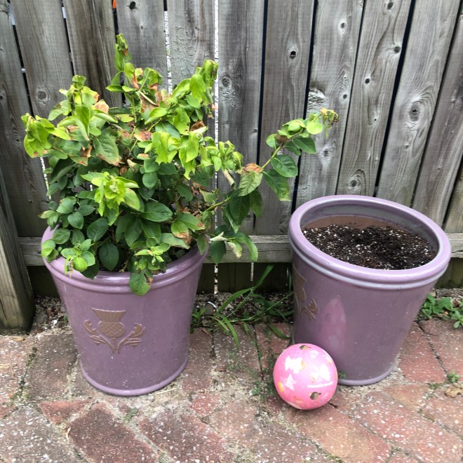 My herb corner, pictured above, has been a mixed bag. The lavender is doing decently well, although it’s a little droopy with the heat today. I picked up some chamomile and golden sage at the farmers’ market to replace the lettuce that bolted last month; neither one is sprouting particularly quickly, but they’re not dying either. And Nugget insisted that we get a pot of pet grass. The farmers’ market ladies helpfully explained that our cats would enjoy eating it. I said we don’t have cats, while Nugget wailed “I waaaaaaaaaant it, Mommy!” from deep inside his plush dinosaur costume. Yeah, we’re that family. So I bought the pet grass, solicited a promise from Nugget that he’d take care of it, he didn’t take care of it, and it promptly died.