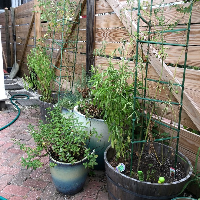 The mint is still prolific, but is looking a little leggy and needs pruned like whoa. It’s on my list for this weekend, if it can make it that long. Sprinkle some salt for me.