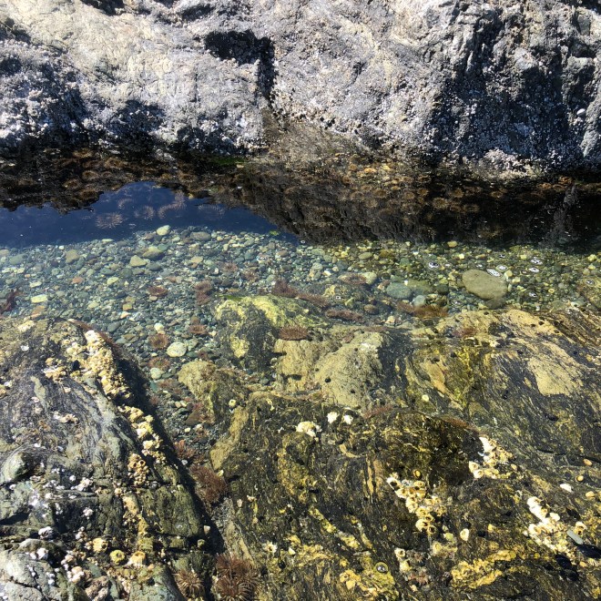 As we were picking our way off the beach, headed for the trail to American Camp, a woman waved us down and quietly told us that there was some excellent tidepooling for those who were willing to scramble over some rocks. Lots of sea anemones, she said. Naturally, we had to check it out – Washington state is famous for its tidepooling opportunities – so we rock-hopped over and she wasn’t kidding.