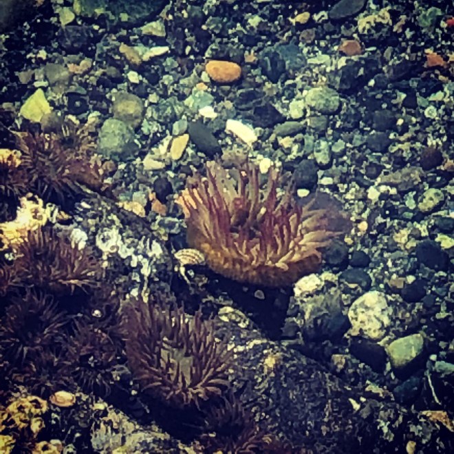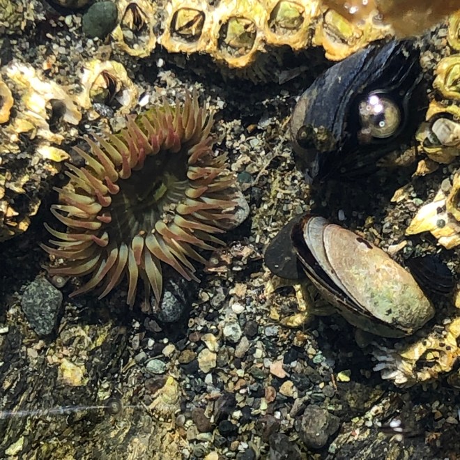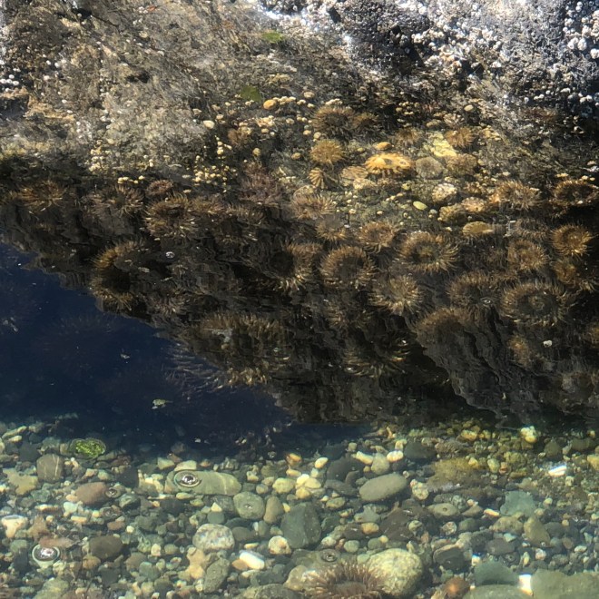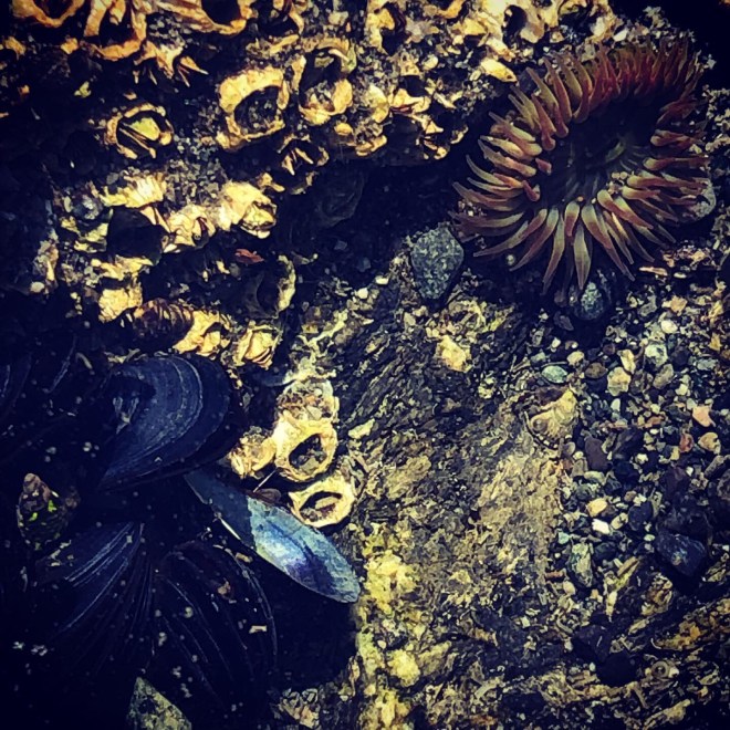 Rockweed, barnacles, clusters of mussels, and lots and lots and lots of sea anemones!