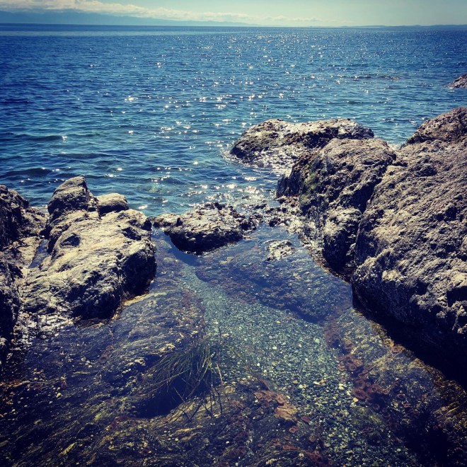 We watched the sunlight dancing on the water for a little while, lost count of the sea anemones, and then went on our way – up to the grassy South Beach Trail and headed for American Camp.