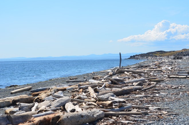 I really wanted a hike, so we had our driver drop us off at South Beach, planning to follow the trail to American Camp (a National Park Service site near the southern tip of the island; English Camp is in the northern section, and while both looked beautiful, we decided on American Camp for its more expansive water views). Before we hit the trail, we spent a little time poking around South Beach, checking out the driftwood and seabirds and – always – scanning for dorsal fins.