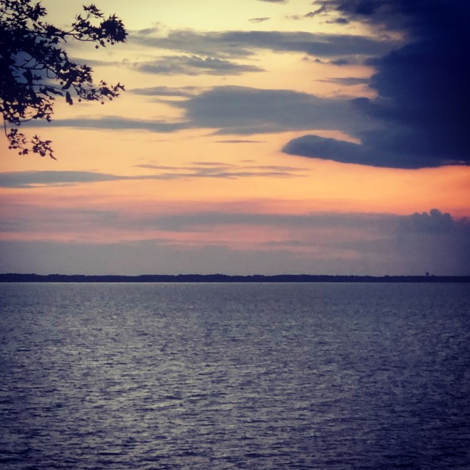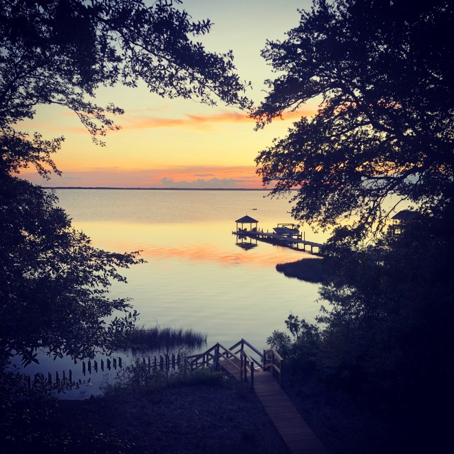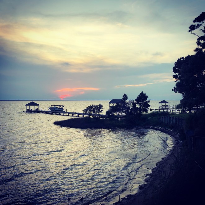The perk of staying soundside, of course – evenings on the deck watching the sun set over the water, a rare sight on the East Coast. The sunsets weren’t especially spectacular while we were there, thanks to some weather systems that always seemed to roll in at dinnertime. But we caught a few light shows. The best, by far, was the first night of our trip:
