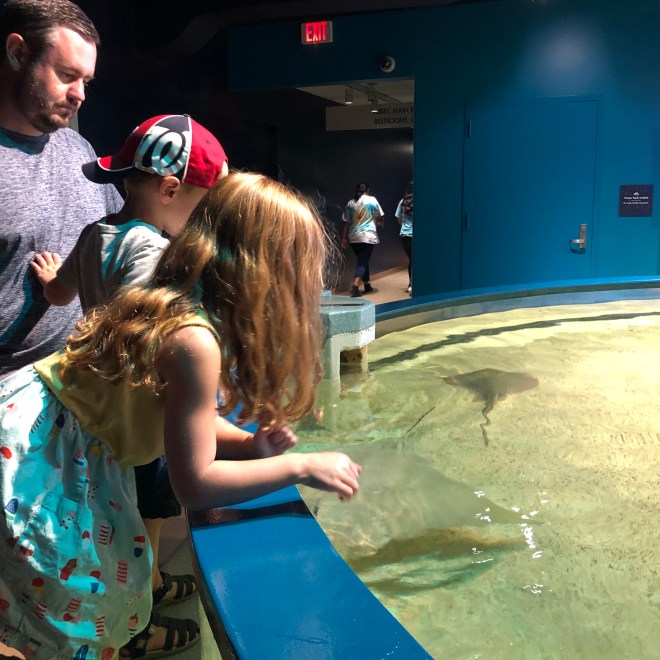 Peanut almost touched one of the stingrays in the touch tank. Almost! She put her hand in the water – nowhere near a stingray, but in the water. Which, I have to tell you, is a hell of a lot closer than I’ve ever gotten to touching any of the animals in any touch tank, anywhere, ever. I prefer to stay at least twenty-four inches from the edge. So I was fist-pumping her bravery.