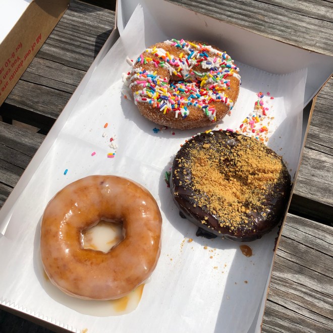 Our first stop upon rolling into town was the iconic Duck Donuts. I know it’s not that big of a deal anymore – there’s a Duck Donuts in the shopping plaza where my kids get their haircuts, for goodness sake – but we couldn’t pass up the opportunity to get Duck Donuts in Duck. Peanut got cinnamon sugar with frosting and sprinkles, Steve had a glazed with salted caramel drizzle, and I got chocolate with graham cracker crumbs. Nugget insisted that he didn’t want a donut, then proceeded to eat three quarters of mine. Oof.