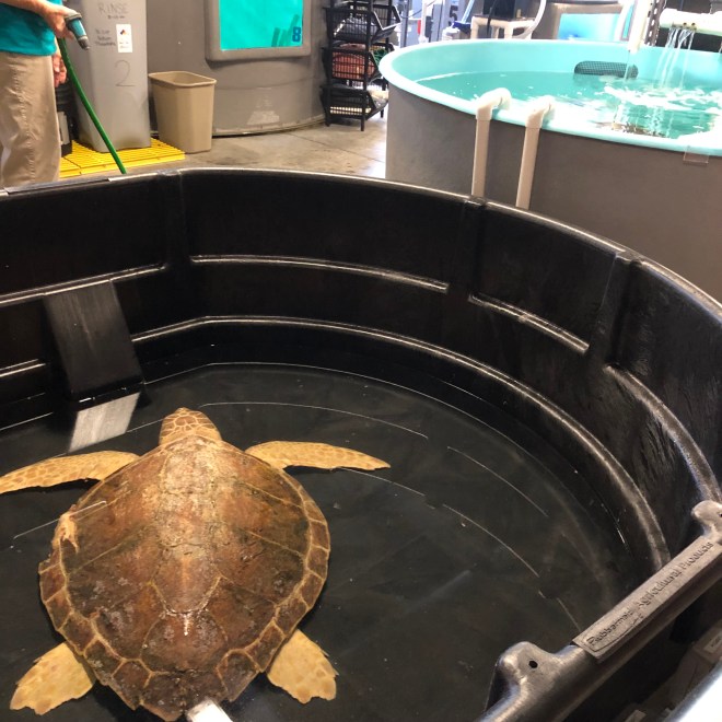 Each turtle was floating in its own little tank, with enrichment toys and a carefully controlled environment. Nugget raised his hand and asked the volunteer interpreter what the turtles’ names were and what parts of their bodies were sick. (Good question for a four-year-old, right?) The interpreter explained that the turtles have a variety of health issues that they are working through, and showed us one that had a chunk of its shell missing from a boat strike. (SOB.) She also explained that the rehabilitators work through themed names and that the current group all had names from Harry Potter. Not having read the books or seen the movies, she had a hard time remembering the names, but she pointed out Longbottom, in tank number 7, and Bertie Bott, in tank 2. (The rehabilitators haven’t named any turtle after Harry himself, yet. As it was explained to us, they have to be really sure that they will be successful with that turtle. After all, Harry Potter is the Boy Who Lived.)