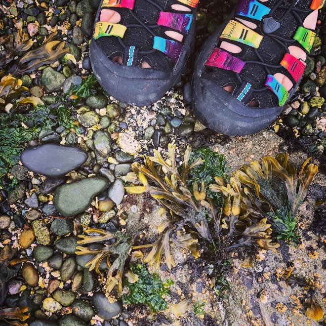 We passed a slightly restless night – unbeknownst to us at the time we pitched our tent, we were sleeping on a slight incline, and I kept slipping into the downhill corner of the tent. I woke up several times with the distinct sensation that I was going over the bluff – I wasn’t, but it didn’t make for the best sleep of the trip. Once the sun finally rose, Steve and I got our campsite broken down quickly, and after I’d helped pack up the kitchen, I wandered down to the beach to do some tidepooling before it was time to go. On our way from Stuart to Patos, we’d passed gorgeous purple ochre sea stars, and I wanted to see one up close.