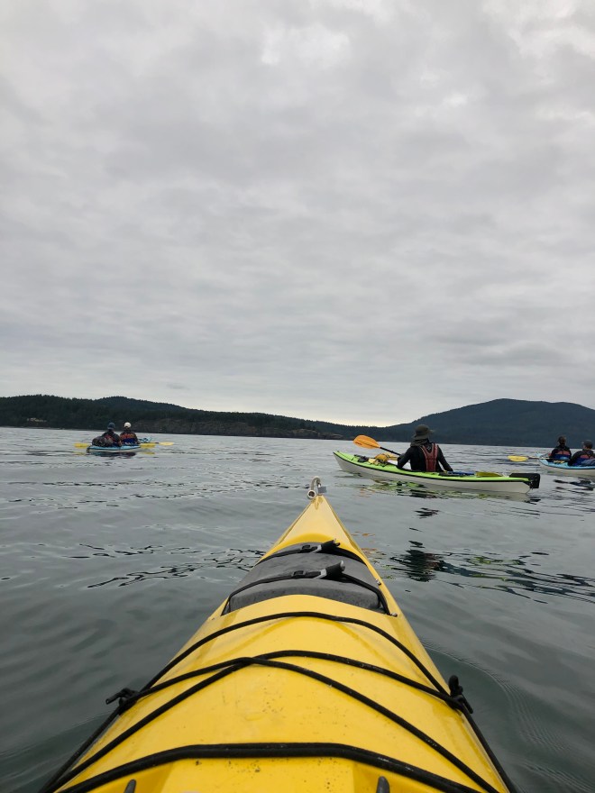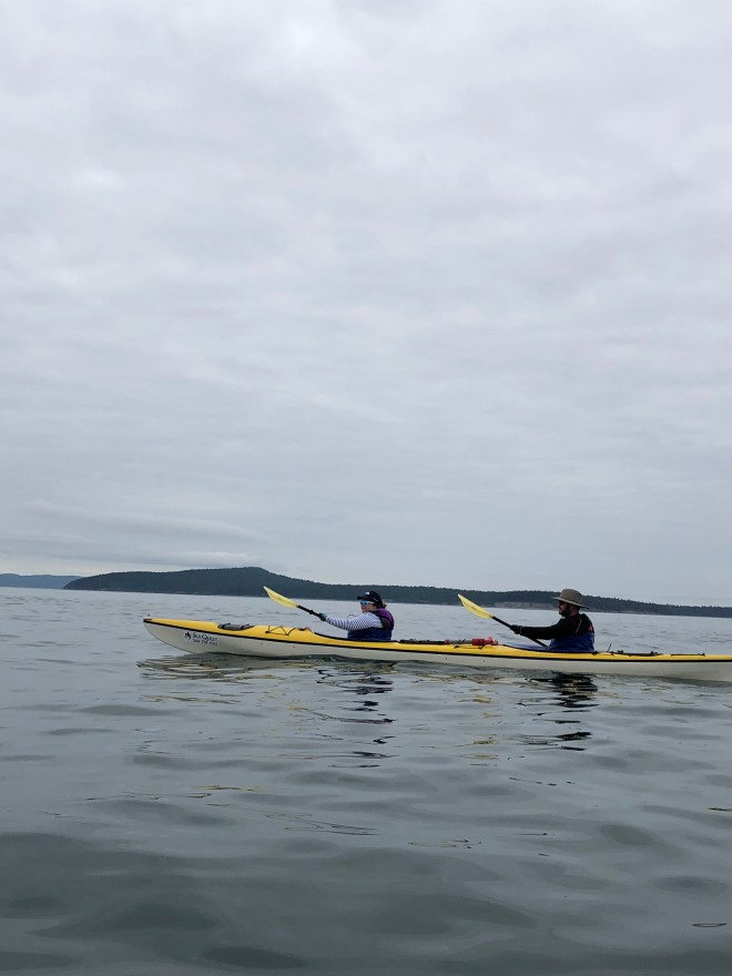 The third day of our kayaking adventure dawned grey and cool, but dry – a definite improvement from the previous day’s paddle. We had a slow morning – Ben was planning the shortest paddle of the trip, a mere 5.5 nautical mile “blue water” crossing from Patos to Point Doughty on the back of Orcas Island. So the gang slept in while a few of us got in an early morning hike, then we all enjoyed a leisurely breakfast around the picnic table before breaking camp and pushing off for Orcas.