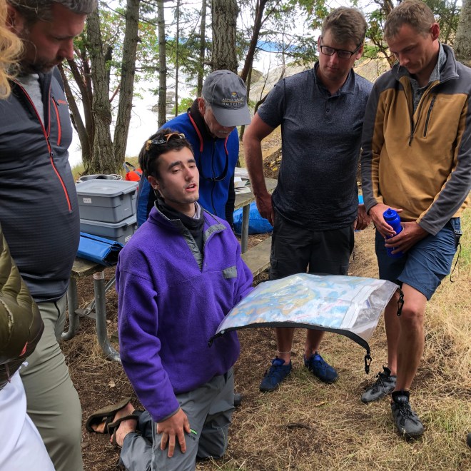 Set up camp, then wandered off to explore. It was a fairly small campground, so we covered the scenery quickly, then Ben called the group together to review options for the next day’s paddling. He told us we had a few options: we could return to Stuart Island and do a bioluminescence paddle (tempting), set up camp near civilization and pick up some beer (pass) or hit Jones Island, which would take us through prime Biggs killer whale hunting waters and be the best chance of seeing orcas from the water.