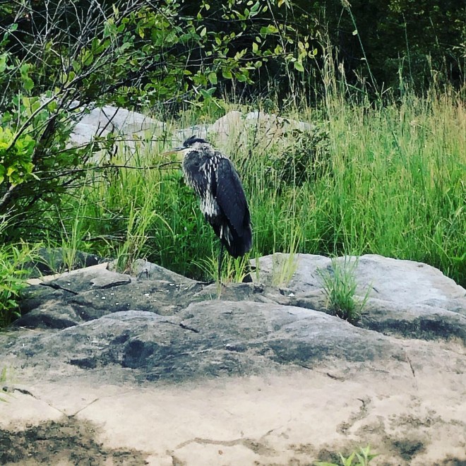 Nugget and I were first to launch this time, and instead of paddling upriver toward Chain Bridge, we meandered downriver while we waited for Peanut and Steve to catch up. The dock employee who launched us suggested we might see some interesting birds on the way, and he wasn’t kidding – there were waterbirds aplenty, and we got up close and personal with this Great Blue Heron. (I think we also saw a cormorant – we weren’t able to get close enough to positively identify it before it took off, but it had the trademark awkward cormorant flight.)
