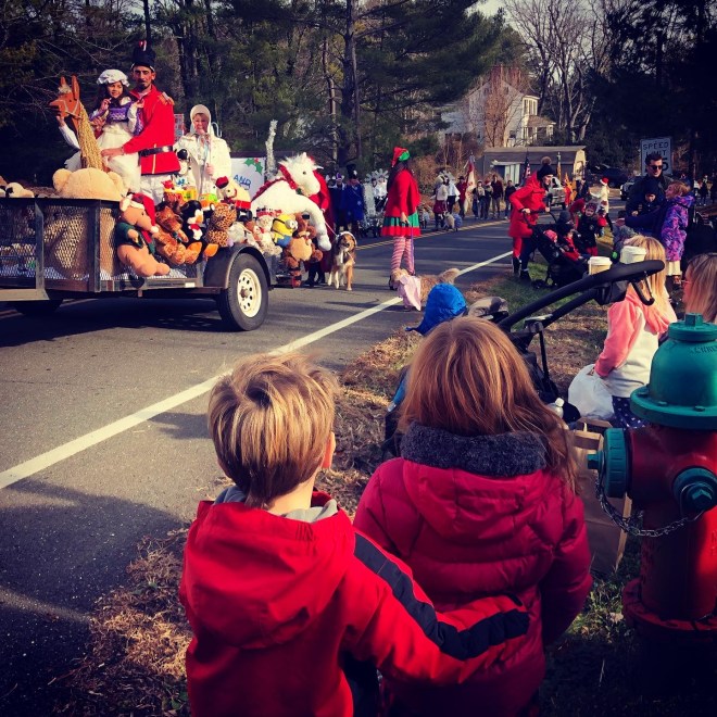 On Sunday we packed up snacks and drove out to Little Washington (also known as Washington, Virginia – a tiny postage stamp-sized town a little more than an hour outside of D.C.) for the annual Christmas in Little Washington parade and market. It’s one of our favorite holiday traditions and we’ve been able to make it happen almost every year. This was a good one; the kids collected a respectable pile of candy and saw Santa riding in a white convertible. I mused to Steve that Peanut and Nugget are growing up with parade memories that are basically the polar opposite of my own childhood parade experiences. My family used to attend the Macy’s Thanksgiving Day Parade in Manhattan every year, and we also went to the Santa Barbara Fiesta parade – both massive, crowded extravaganzas. These two will remember small-town parades and scrambling to pick up mini candy canes tossed by the local Girl Scouts. Just as good – but so different. It was a nice day, and I needed it to calm my racing mind after last week.