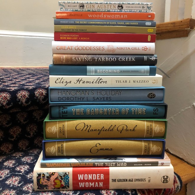 So much great reading material here! Steve added to my collections of NYRB classics, poetry, Wonder Woman, and Folio Society – and completed my set of the Folio editions of Jane Austen. Hurray, thank you Steve! My mom somehow found the one book I asked her for – Woodswoman – which I worried would be unavailable everywhere (it’s not exactly a buzzed-about title!) and added a few others that I wouldn’t have thought to buy for myself but that look delightful. And my brother’s gift looks like a fascinating read. Clearly, I have my winter’s reading planned out.