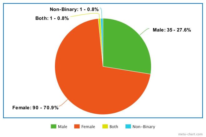 Wow – I read a lot more women than men this year. I usually read more female authors, but it’s a little closer to even most years; in 2019 I was heavily into female authors. Only one “both” – not because I didn’t read other books with both male and female contributors, but this year I categorized those either male or female depending on the editor. But I still had to have the “both” category because I read To Kill a Mockingbird: The Graphic Novel, an adaptation of Harper Lee’s classic by graphic novelist and artist Fred Fordham. They don’t get equal billing, because: Harper Lee. But Fordham needed some credit for his wonderful adaptation work. And – this is very exciting – I read one book by a gender non-binary author this year! That would be Red, White and Royal Blue, by Casey McQuiston. (I’d love to read more gender non-binary authors in 2020, if anyone has recommendations.)
