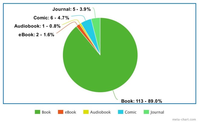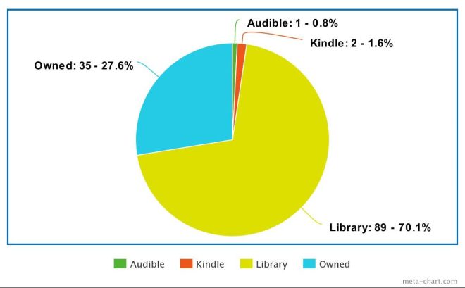 And finally, the source of the books. Again, one sourced from Audible and two from Kindle, and the rest divided between the library and my own bookshelves. I surprised myself by reading more heavily than usual off my own shelves this year – the library to own-shelves ratio was only two to one; it’s usually more heavily weighted to the library. Although I poke fun at myself for my library addiction, I’m really happy either way. I have a wonderful home library that I’ve collected carefully and thoughtfully, and I’m usually guaranteed to enjoy what comes off my own shelves. But I just can’t quit my weekly walks to the neighborhood branch of my city library. And I have no self control once I get there, but I’m also fine with that.