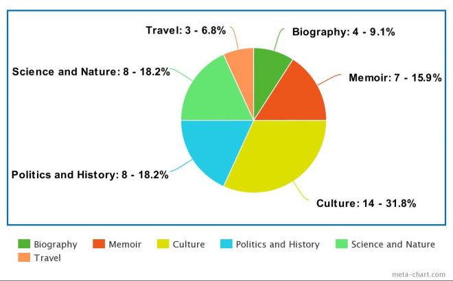 Let’s break that down a bit more. Starting with fiction, I read fairly widely across genres. Classics were the largest component, which is – again – as expected. The older I get, the more I know what I like and what I don’t like – and I find that I enjoy most classics more than anything else. There are exceptions – for instance, I really didn’t get along with Flannery O’Connor this year – but usually, a classic novel or story collection is likely to be a winner for me. I love a good mystery novel, too, and that shows in the high number I read this year. What was more unusual? Ten science fiction or fantasy novels, and sixteen historical fiction – neither a genre that I usually read much during the year; I always feel surprised that I didn’t read more historical fiction, but this year I’m not. Sixteen titles made up a full 20% of my total fiction list this year, which is huge for me. On the other hand, only one literary fiction title – that’s also unusual, and reflects a little less effort on my part to keep up with the big lit-fic titles of the year (and shelving some in historical fiction or science fiction and fantasy when they could, perhaps, do double duty).