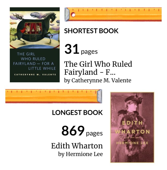 Again according to Goodreads, the shortest book I read was the bite-sized novella The Girl Who Ruled Fairyland – For a Little While, by Catherynne M. Valente. And the longest book was the dense doorstopping biography Edith Wharton, by Hermione Lee. Edith Wharton was wonderful, but it did take me a loooooooooong time to get through it.