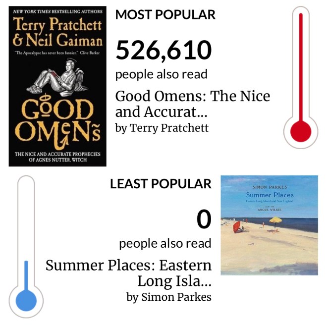 Lots of other people read Good Omens: The Nice and Accurate Prophecies of Agnes Nutter, Witch, this year. It was a re-read for me – I read it for my book club, and also to prepare for watching the fabulous adaptation on Amazon Prime. And it seems I was the only Goodreads user who read Summer Places this year. What a shame! Simon Parkes paintings, interspersed with essays about plein air painting and the Hudson River School. Why don’t more people pick that up? The mind boggles. I’m not being sarcastic. It’s a beautiful book.