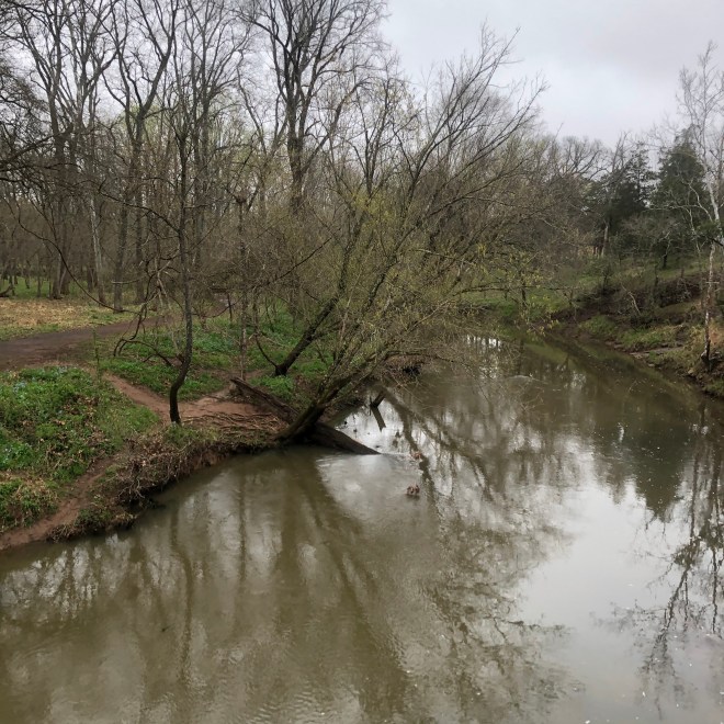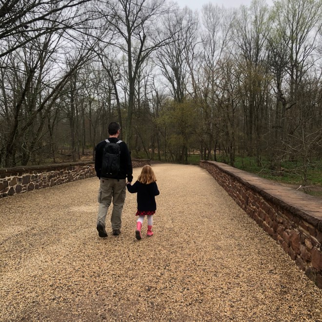 Civil War buffs, this is the famous Bull Run battlefield.  Steve and I hiked the battlefield itself years ago – pre-small hikers – but had never been to this part of the park.  We made for the Stone Bridge parking area, lured by the promise of bluebells growing on the banks of the legendary Bull Run.