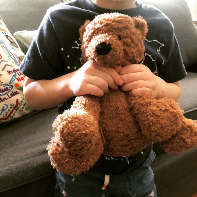 Loving. I’ve been waiting five years for Nugget to really bond with one of his stuffed animals (he calls them “lovies” – awwww). When Peanut was very small, she got into a committed relationship with a stuffed Peter Rabbit, and he’s still number one for her, but Nugget has never been a cuddly toy kind of guy. When he was a baby, I was his comfort item, which was fun and wonderful but also exhausting after eighteen months of being summoned to his room multiple times a night. Then there was a phase where he really loved his hard toys, and fell asleep every night for months with his arm draped around a recycled plastic fire truck. But I’m pleased to report that finally, at five, Nugget has a best (stuffed) friend. Meet Bear. (Creative naming is not Nugget’s thing; for that, you want Peanut.) The important thing to know about Bear is he is Nugget’s best friend and also his sibling, and he has to go everywhere with us. We had a small crisis on Saturday when Bear fell into the couch and was missing for about 20 minutes. But you should also know Bear’s history – by which I mean: how Bear came to be part of our family. You see, you’ve heard of brown bears, black bears, grizzly bears, sloth bears – but have you heard of Squeak Bears? Squeak Bears are very rare and they come from a beautiful land called Squeakalia, which is a mile off the coast of Antarctica. (And now you know). Nugget swam from Antarctica to Squeakalia; the experience was a prize he won after being the first student in his dive class to scuba explore every exhibit in the Baltimore Aquarium. (Real news.) And that is where he met Bear, and how Bear came to leave his home on Squeakalia and join our family. Guys, I literally cannot get enough of Bear’s personal history. I will sit on the couch for hours listening to tales of Squeakalia.