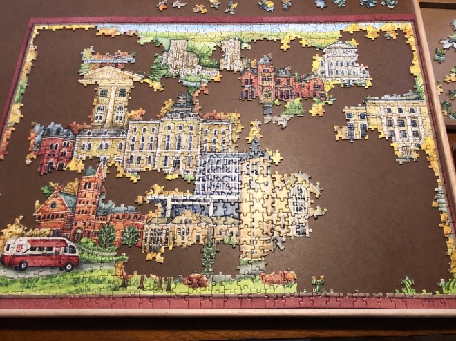 Making. So, there’s the usual stuff – a couple of loaves of sourdough sandwich bread and other dinners for the family. And quarantine edition making: progress on this awesome 1,000 piece puzzle, which I picked up from the Cornell Store at Reunion in 2018 and have been apparently saving for a global pandemic? Well, I’m getting to it now. (Also, I do like that it is suddenly cool to do puzzles and I no longer have to hide.) I said to Steve that I feel like there are stages to a big puzzle like this. First, you get the outline put together and you feel pretty good. Then you realize how much you have left to do and it starts to be daunting and overwhelming and you think you’re never going to be able to do it. Then there comes a point, after days of puttering, when it suddenly clicks and you can see how it all fits together, and then it goes fast. I’ll probably be done by this time next week and on to the next puzzle. Finally, making: I don’t know how this is going to go yet, but I brought my film camera (my dad’s old Minolta from the 1970s, which I had cleaned up and refurbished last fall) out on our hike on Sunday and snapped about a third of a roll. I’ll have to wait until I finish the roll and get it developed to see how it went, but I’m excited to play around with film photography.