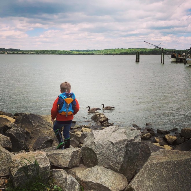 I had a nice weekend. My Mother’s Day wish was to spend as much time outside as possible. I’m getting very stir-crazy, cooped up in my townhouse day in and day out, and all I wanted for Mother’s Day was fresh air. Well, fresh air and as little bickering and back-talk as possible, getting greedy now. Saturday was a little grey and cool, so we stayed in the neighborhood and took a walk down to the waterfront – pretty standard stuff these days. Nugget has gotten very into birds in the last few months – for Christmas, all he asked Santa for was “a book about birds,” and also, isn’t he the sweetest? So he was stoked to see the waterfowl down at the river; he climbed down over the rocks and stood in the sand at the water’s edge and pointed excitedly. At one point, I saw him struggling with his pocket, then realized that he had quietly stuffed his little blue camera in there before we left, without saying anything to anyone. He got the camera out, turned it on, and studiously pointed it at a duck while I died of the cuteness. (Also, it was a good reminder for me: I find geese obnoxious and I tend to overlook ducks; seeing him get so excited about these birds that I usually overlook was a lesson. Stop, take it all in, and enjoy.)