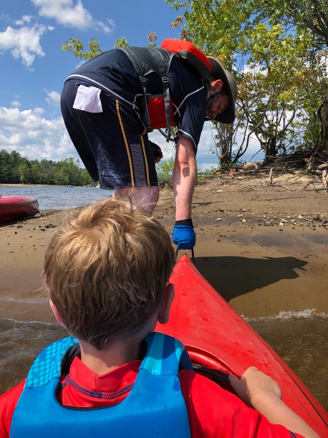 Skipper Nugget was READY to go. We let him decide where to paddle, and he said he wanted to paddle across the lake. That’s 37 miles, so probably not doable in a day. (Definitely not doable in a recreational kayak with a densely-packed duffer.) But some additional questioning revealed that he actually wanted to paddle across the bay (whew) to Bass Island. That, we can do.