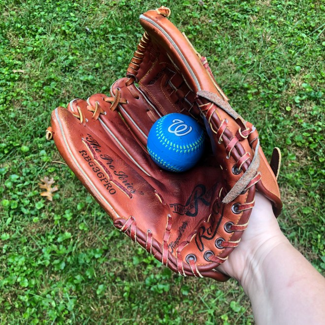 I borrowed Steve’s glove, which used to belong to his dad. Nice and supple, but no good for me because I’m not a lefty – whoops. Also, is it me or does this glove look angry that it is being asked to catch a Washington Nationals baseball? This glove is a Yankees fan.