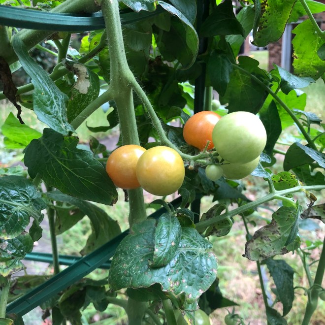Sadly, most of the tomatoes look like this: green, green, greeeeeeeen. Anyone have any recipes that use green cherry tomatoes? We’re weeks away from our first frost, so I don’t think it’s time to declare defeat. But I’m also not convinced we are going to have enough hot sun to actually ripen these. Blah.