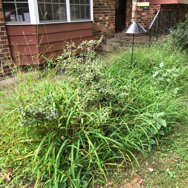 We’re heavy into planning for next year. This jungle is our front walk; Steve has decided that he wants to rip this all up and start fresh (with something inexpensive, because we all know my position on spending a lot of money improving someone else’s property). Since I don’t know which of these plants are the weeds and which are planted here intentionally, that seems like a good idea.